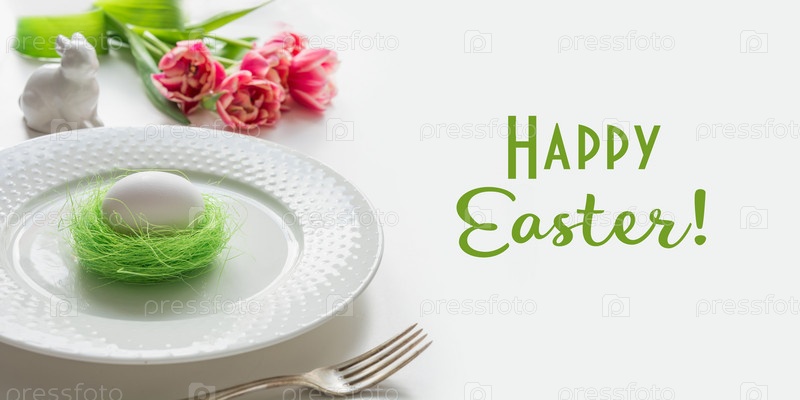 Пасхальная композиция из столовых приборов, цветов и яиц на белом. Закрыть. Пространство с текстом