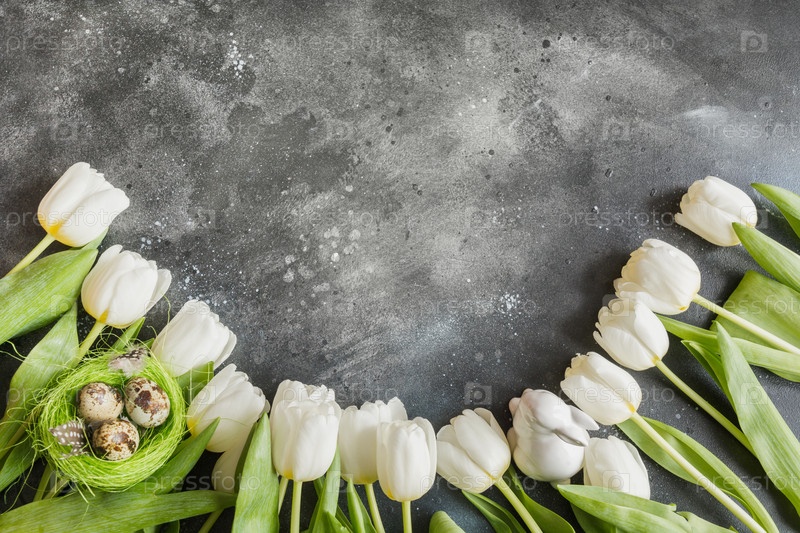 Пасхальный узор. Граница белых тюльпанов, яйца, гнездо на винтажном сером. Вид сверху с копией пространства