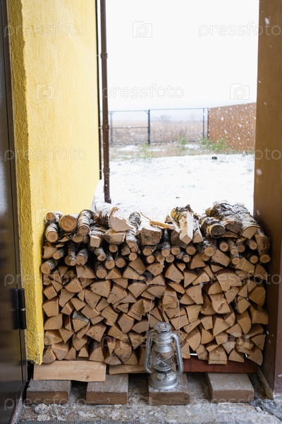 Дрова на заснеженном крыльце дома заготовлены на зиму. Отопление жилья печным камином, экономия электроэнергии и газа в кризис, экологичность