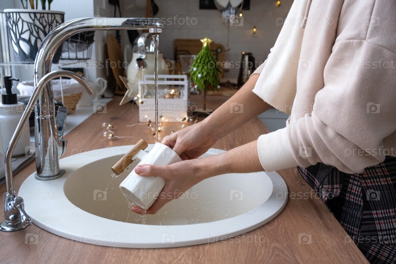 Уборка кухни перед новогодними и рождественскими праздниками. Моющее средство, сухой порошок, губка, перчатки на раковине. Праздничный декор на белой кухне, уютный интерьер дома