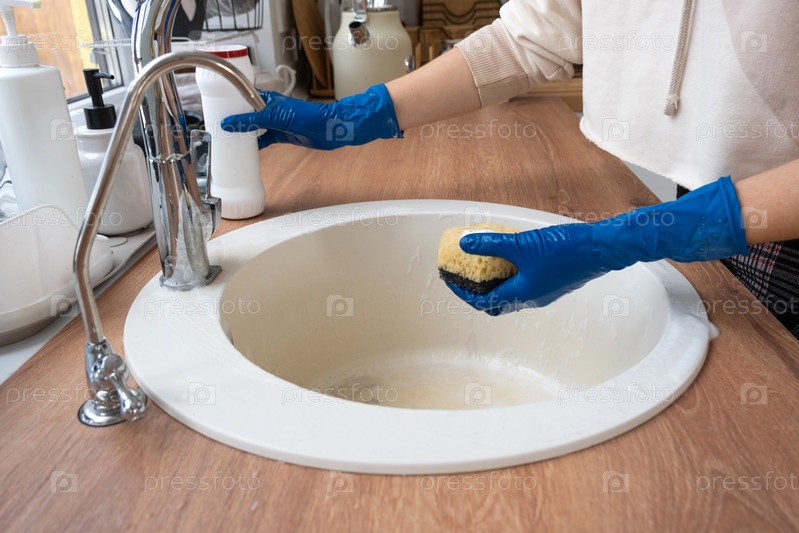 Очистка раковины на кухне, руки в перчатках и губке, моющее средство, сухой порошок. уютный интерьер дома, наведение порядка, чистота, дезинфекция