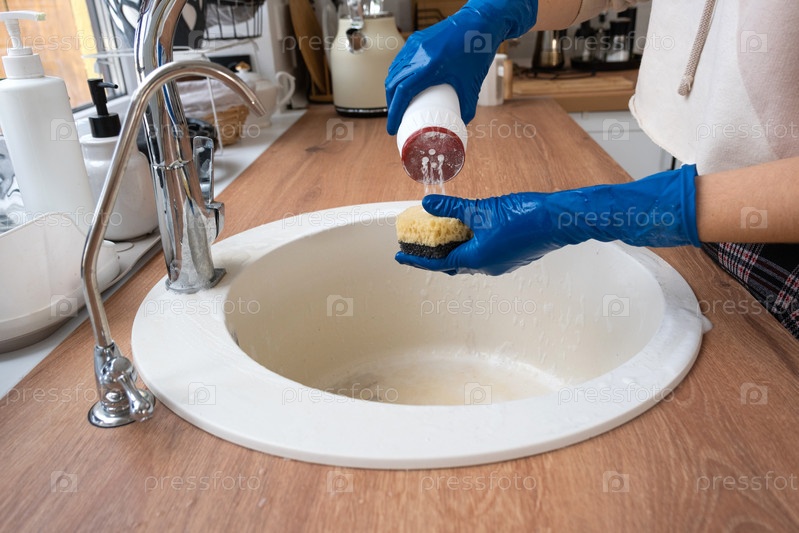Очистка раковины на кухне, руки в перчатках и губке, моющее средство, сухой порошок. уютный интерьер дома, наведение порядка, чистота, дезинфекция