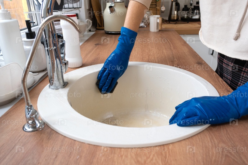 Очистка раковины на кухне, руки в перчатках и губке, моющее средство, сухой порошок. уютный интерьер дома, наведение порядка, чистота, дезинфекция