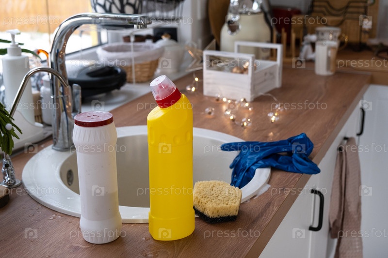 Уборка кухни перед новогодними и рождественскими праздниками. Моющее средство, сухой порошок, губка, перчатки на раковине. Праздничный декор на белой кухне, уютный интерьер дома