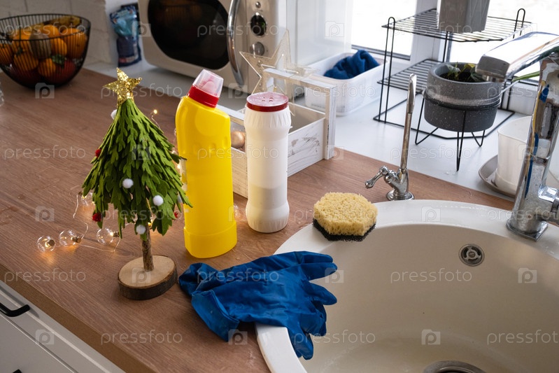 Уборка кухни перед новогодними и рождественскими праздниками. Моющее средство, сухой порошок, губка, перчатки на раковине. Праздничный декор на белой кухне, уютный интерьер дома