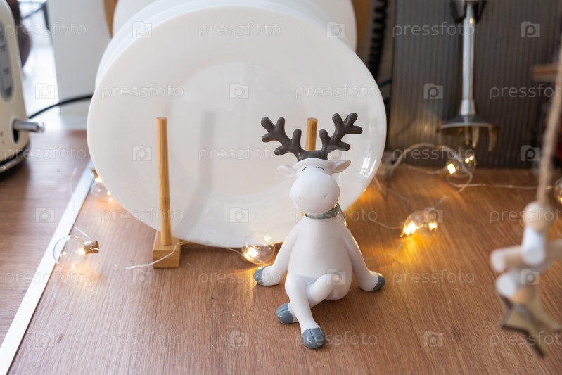Праздничный новогодний декор и беспорядок на кухне, подставка с тарелками, милые олени. Новый год, настроение, домашний интерьер, крупный план