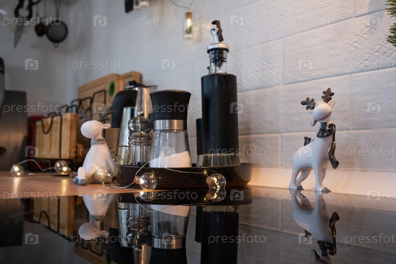 Праздничный новогодний декор и беспорядок на кухне, подставка с тарелками, милые олени. Новый год, настроение, домашний интерьер, крупный план