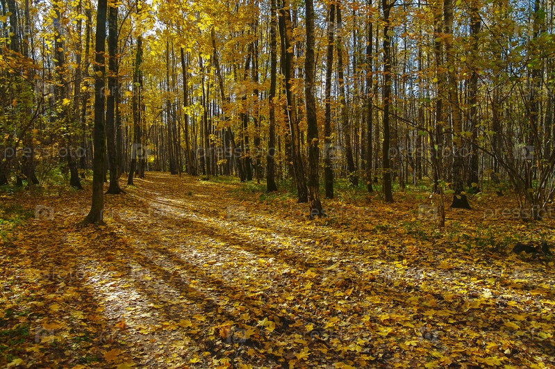 Полоски света и тени на опавшей листве на тропинке в осеннем лесу. Середина октября. Битцевский лесопарк, Москва, Россия