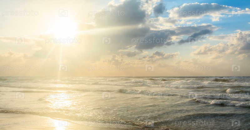 Волны катятся по берегу. Тихий красивый золотой закат на море. Летний фон природы