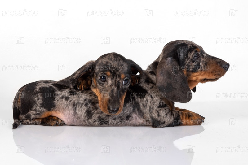 Пара мраморных гладкошерстных щенков таксы устала от фотосессии и заснула друг на друге, изолированная на белом