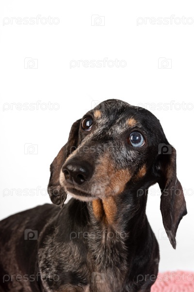 Портрет старой грустной седой таксы с глазами разного цвета, изолированной на белом фоне