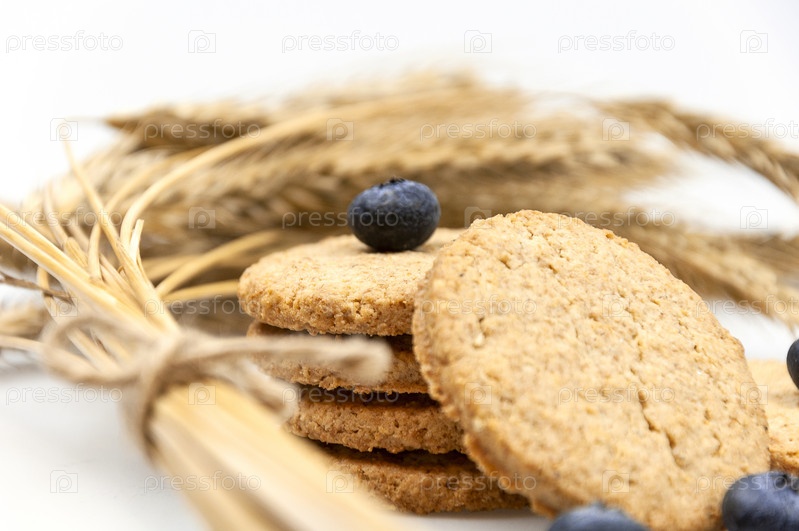 Печенье с отрубями и синими ягодами на белом фоне с ржаными колосьями
