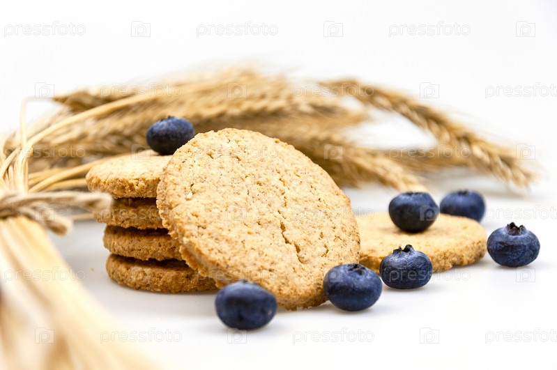 Печенье с отрубями и синими ягодами на белом фоне с ржаными колосьями