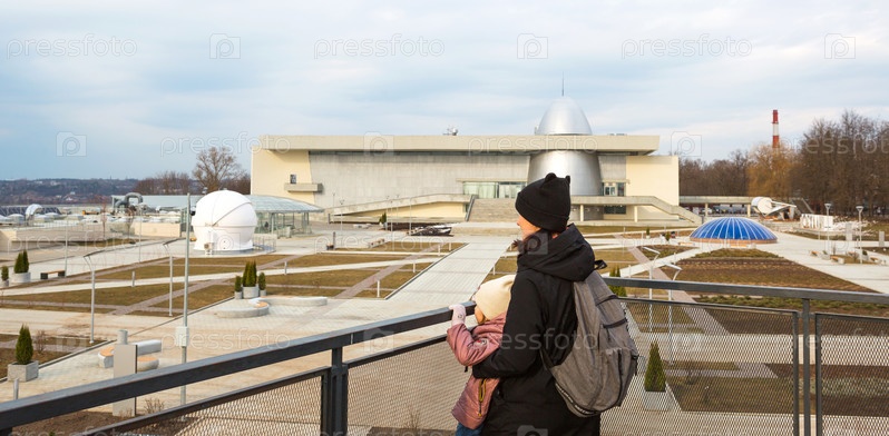 Калужский музей космонавтики - подготовка к открытию 2-й очереди. Мать и дочь на смотровой площадке перед музеем. 7 апреля 2021 г., Калуга, Россия
