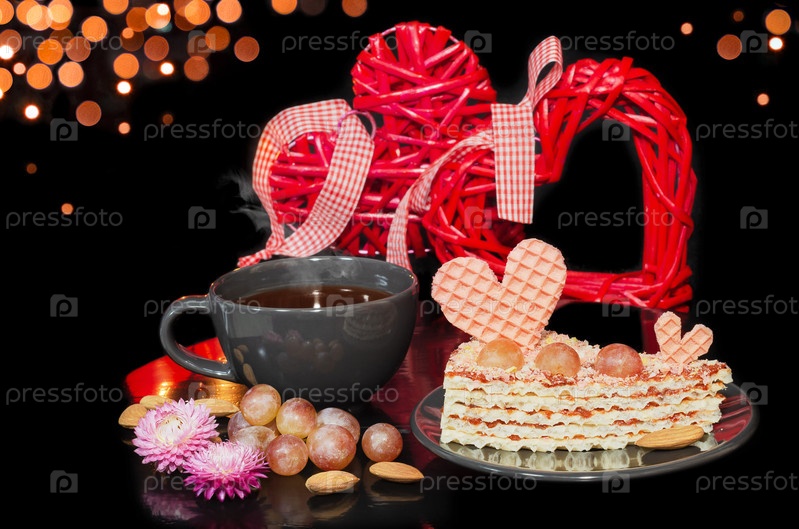Вафельный торт, украшенный сердцем и виноградом, и горячий чай в чашке. Черный фон с боке и сердцами. Концепция дня святого валентина, выборочный фокус