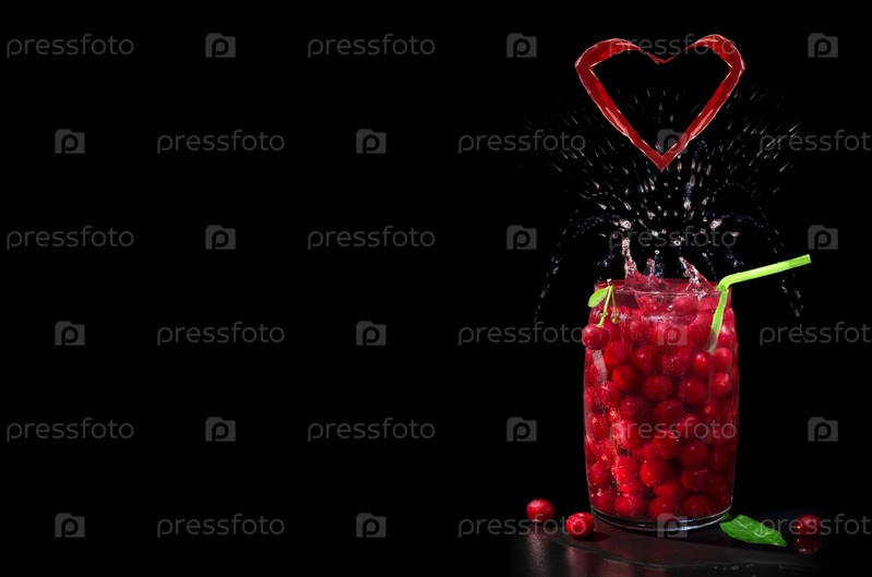Холодный напиток с ягодами вишни в банке, на черном фоне