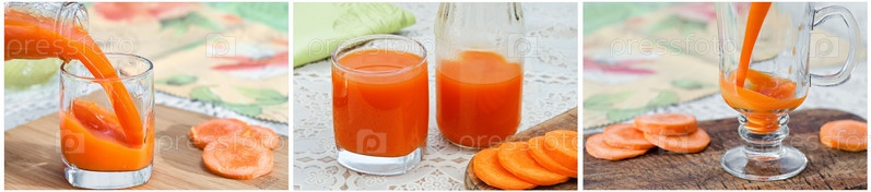 Коллаж из фотографий со свежим морковным соком