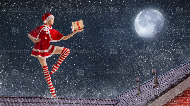 Танцующая балерина с подарком в руках в костюме Санта-Клауса на крыше дома в рождественскую ночь на фоне звездного неба