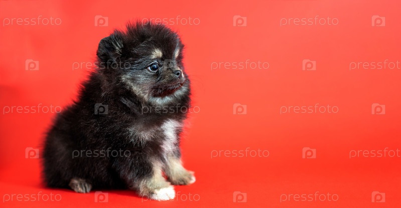 Милый маленький щенок померанского шпица сидит на красном фоне. Пушистый щенок