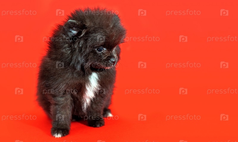 Портрет милого маленького черного померанского щенка сидит на красном фоне. Пушистый щенок крупным планом