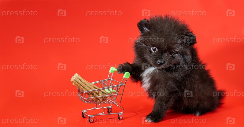 Милый пушистый померанский щенок на красном фоне с тележкой с едой и угощениями