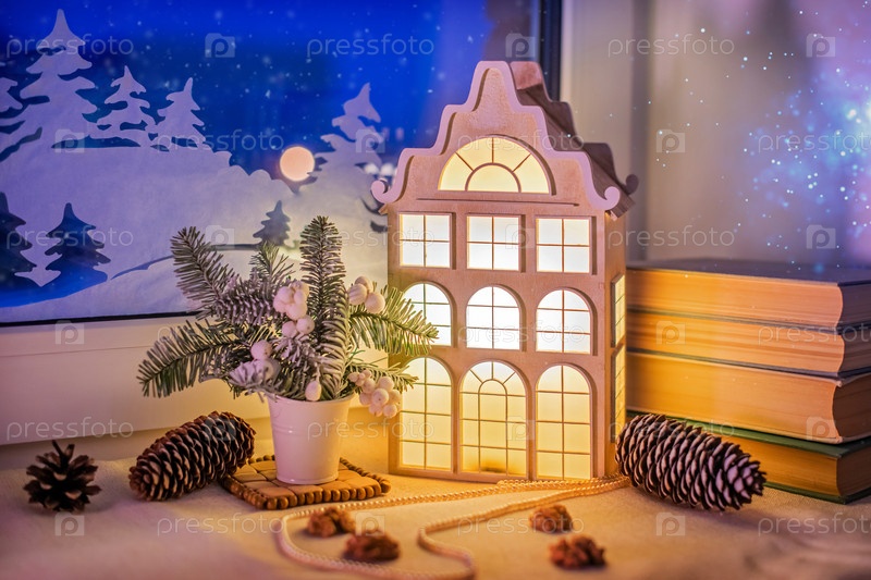 На подоконнике, среди елочных игрушек, на фоне ночного снега и бумажных украшений светится ночник в виде старинного европейского домика