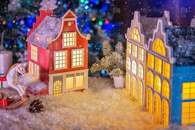 Праздничная композиция из лампы в виде старинного европейского дома, игрушечной лошадки, еловых веток и шишек на фоне расфокусированных гирлянд