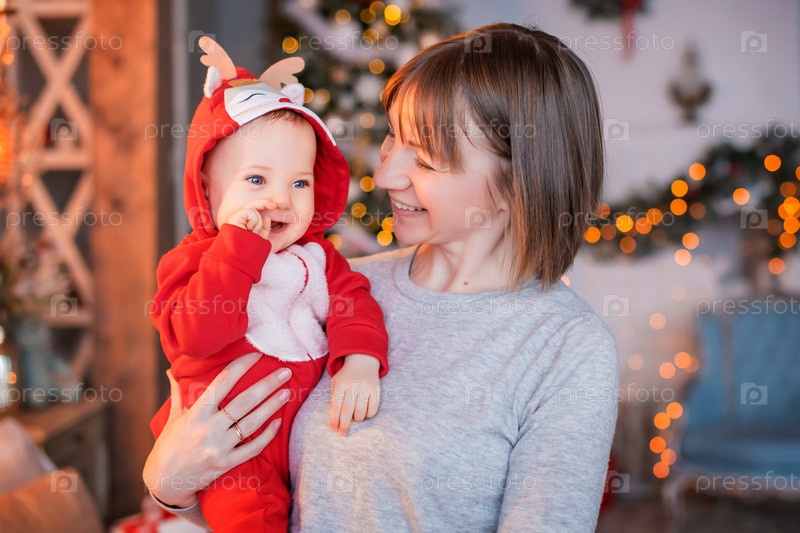 Счастливая мама играет со своим малышом в красном костюме оленя Санты на фоне елки и световых гирлянд