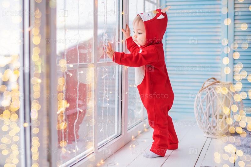 Веселый малыш в красном костюме оленя санты играет на фоне окна и огней гирлянд