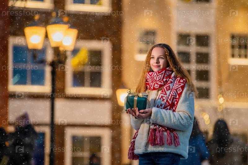 Рождественский портрет красивой девушки в теплой одежде и шарфе, стоящей на улице, украшенной к Новому году, с подарком в руках