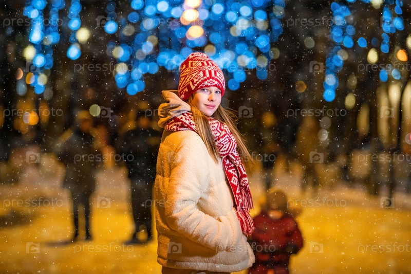 Симпатичная девушка идет по зимней заснеженной вечерней улице разукрашенного города, обернувшись, чтобы заглянуть в кадр