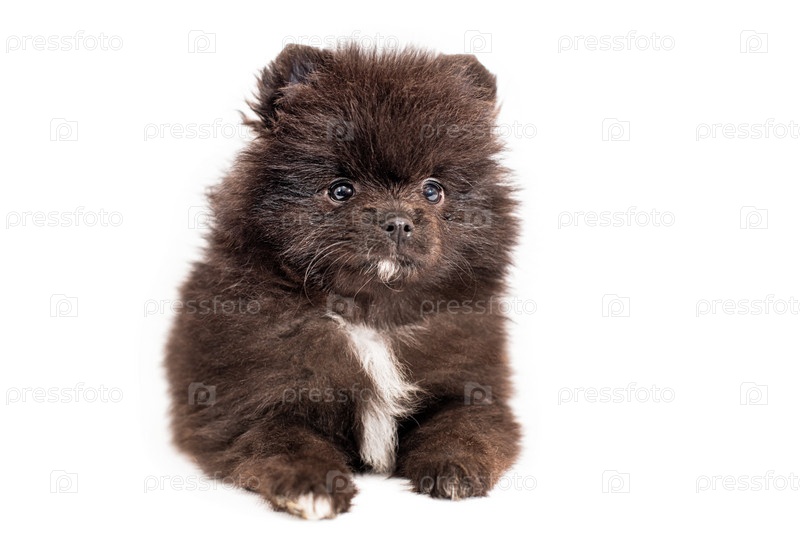 Милый маленький щенок померанского шпица сидит на красном фоне. Пушистый щенок