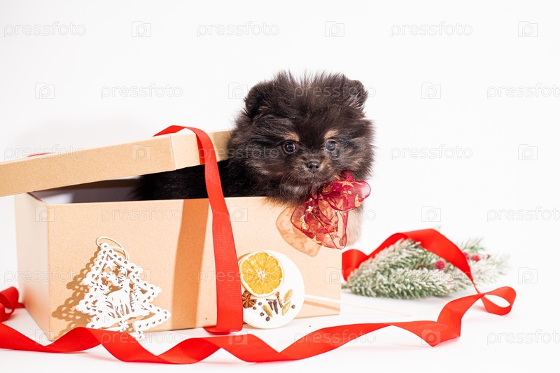 Милый пушистый щенок шпица с красным бантом выглядывает из большой подарочной коробки с красной лентой на белом фоне