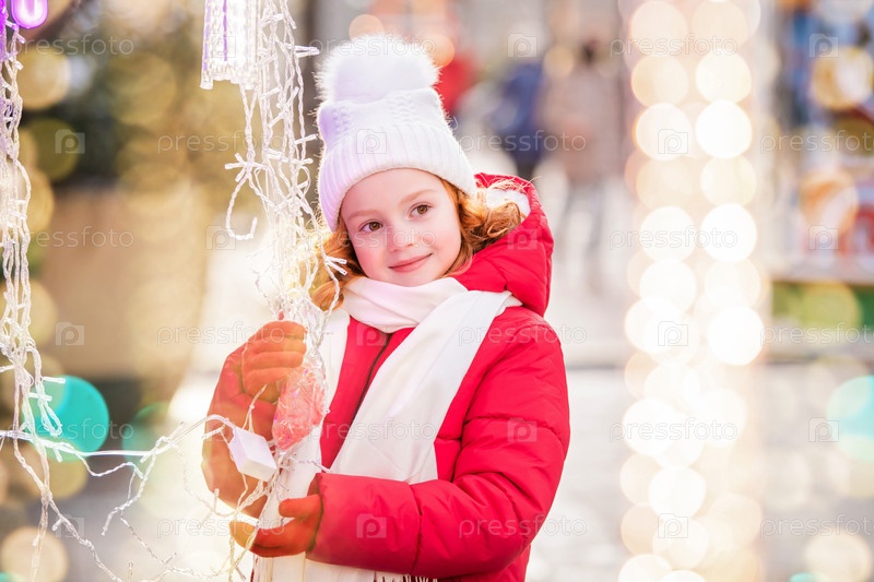 Рыжеволосая девочка гуляет и смотрит на прилавок с гирляндами на празднично украшенной рождественской ярмарке в городе
