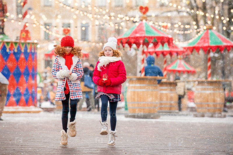 Дети, рыжеволосые сестры, идут с покупками игрушек в руках на празднично украшенной рождественской ярмарке в городе