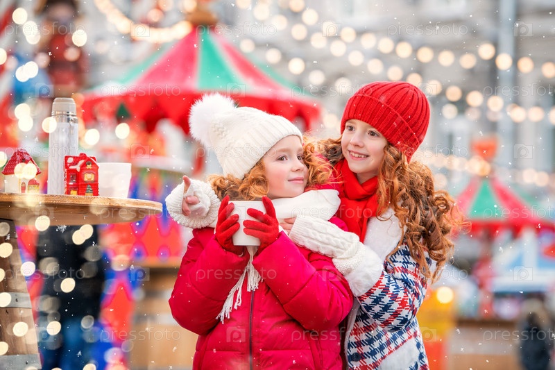 Дети, рыжеволосые сестры греют руки в перчатках кружкой горячего чая на празднично украшенной рождественской ярмарке в городе