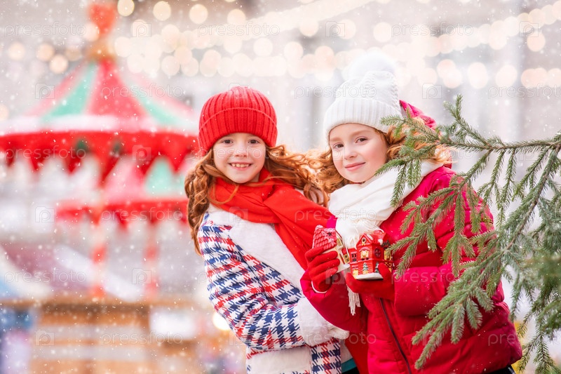Дети, рыжеволосые сестры, прячутся за елкой с игрушками в руках на празднично украшенной рождественской ярмарке в городе