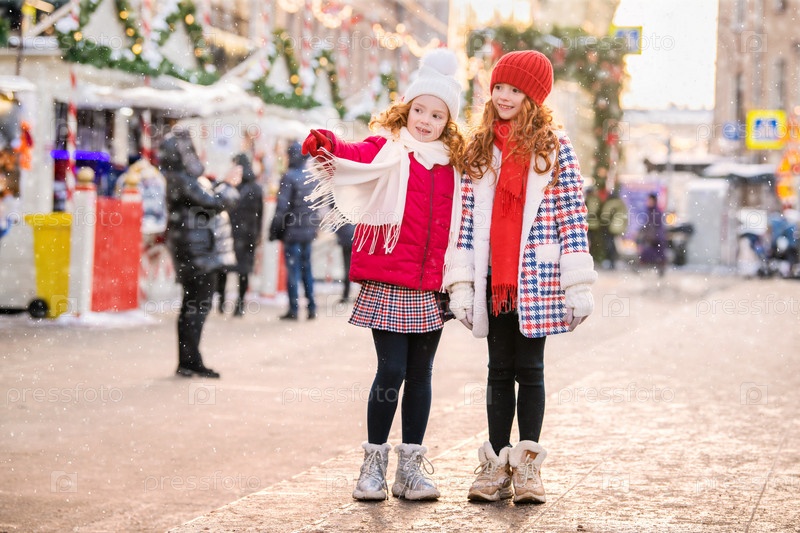 Дети рыжеволосых сестер гуляют по празднично украшенной рождественской ярмарке в городе
