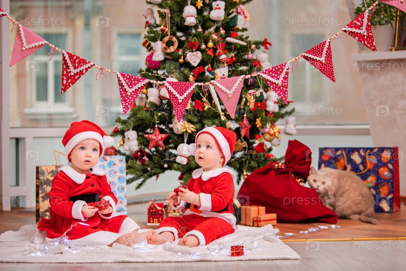 Счастливые близнецы, одетые как Санта-Клаус, сидят возле рождественской елки дома в гостиной