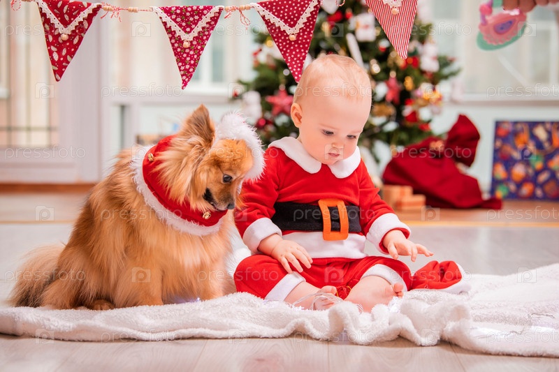 Ребенок в костюме санта-клауса и пушистый померанский шпиц вместе играют дома на фоне украшенной елки