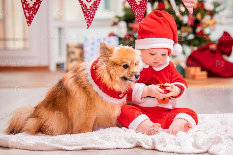 Ребенок в костюме санта-клауса и пушистый померанский шпиц вместе играют дома на фоне украшенной елки