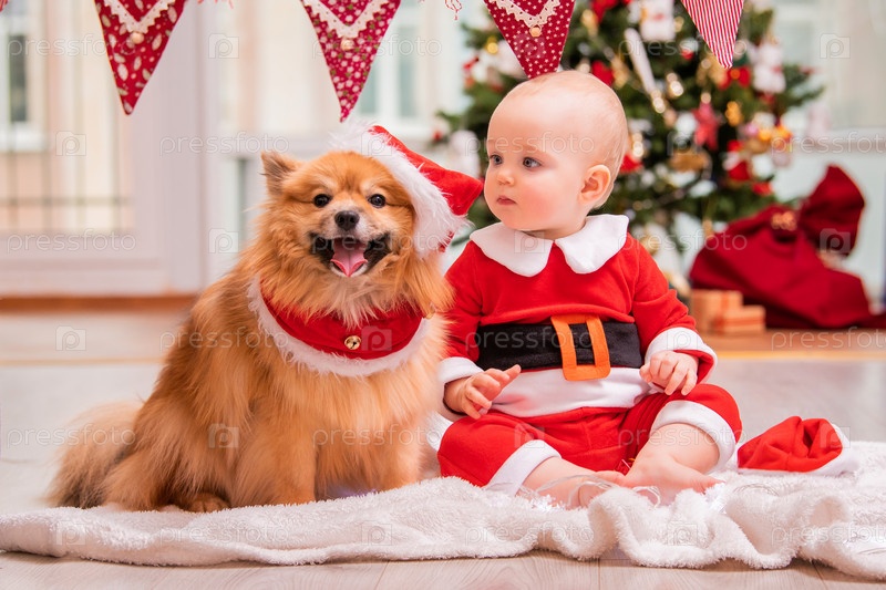 Ребенок в костюме санта-клауса и пушистый померанский шпиц вместе играют дома на фоне украшенной елки