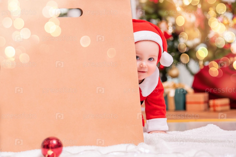 Веселый малыш в костюме санта-клауса выглядывает из-за большой сумки для подарков на фоне елки, копирует пространство