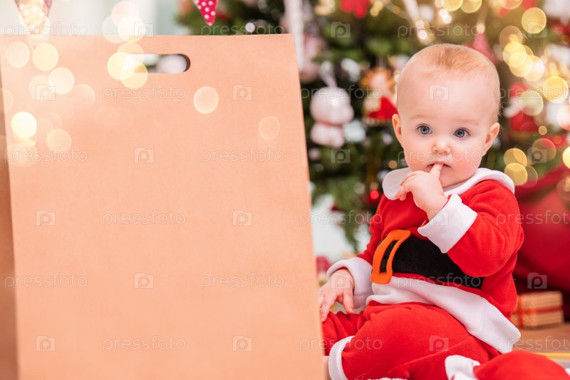 Задумчивый ребенок в костюме санта-клауса с пальцем во рту сидит возле большой сумки для подарков на фоне елки, копирует пространство