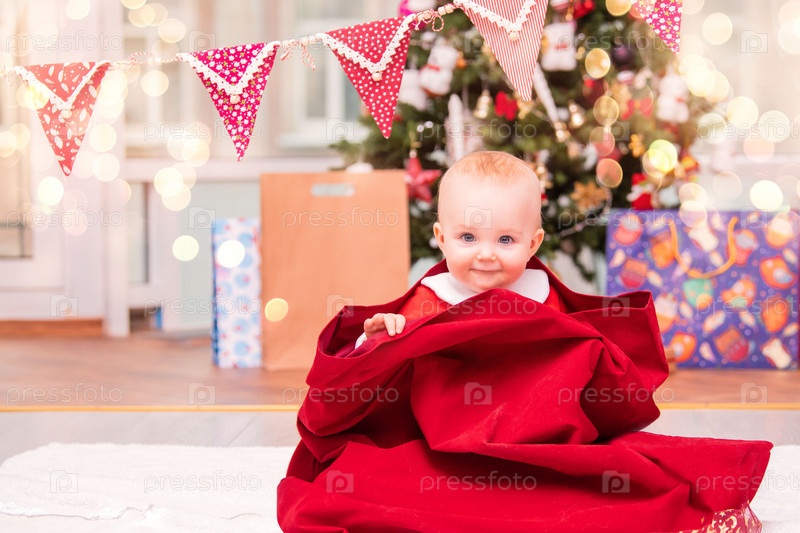 Очаровательный малыш в костюме Санты выглядывает из рождественского мешка Санта-Клауса в украшенной гостиной с рождественской елкой