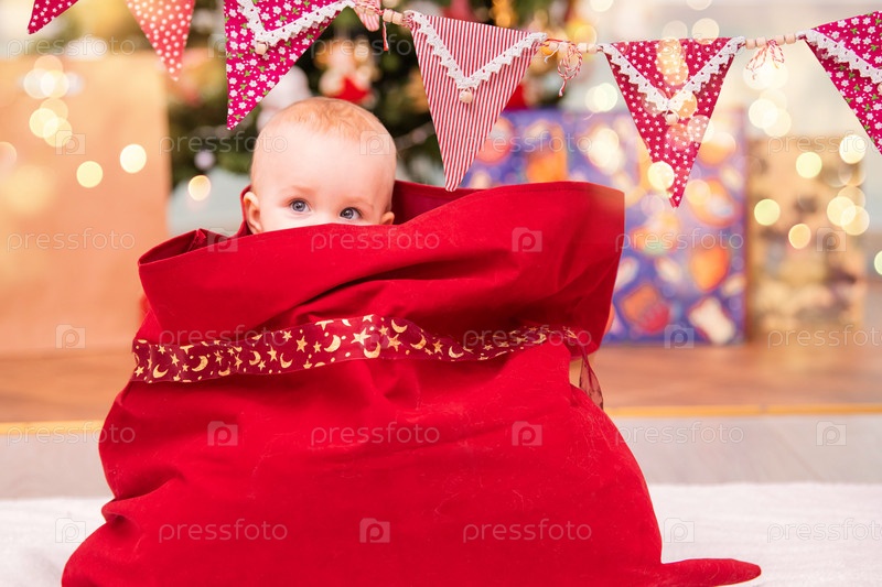 Очаровательный малыш, одетый как Санта, выглядывает из рождественского мешка Санта-Клауса в украшенной гостиной с елкой