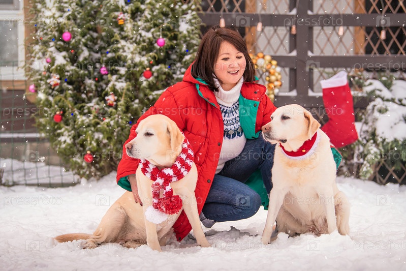 Женщина играет с лабрадорами возле украшенной елки во время снегопада зимой во дворе многоквартирного дома