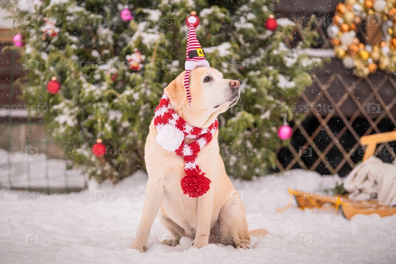 Золотой лабрадор в шарфе сидит возле украшенной елки и катается на санях во время снегопада зимой во дворе жилого дома