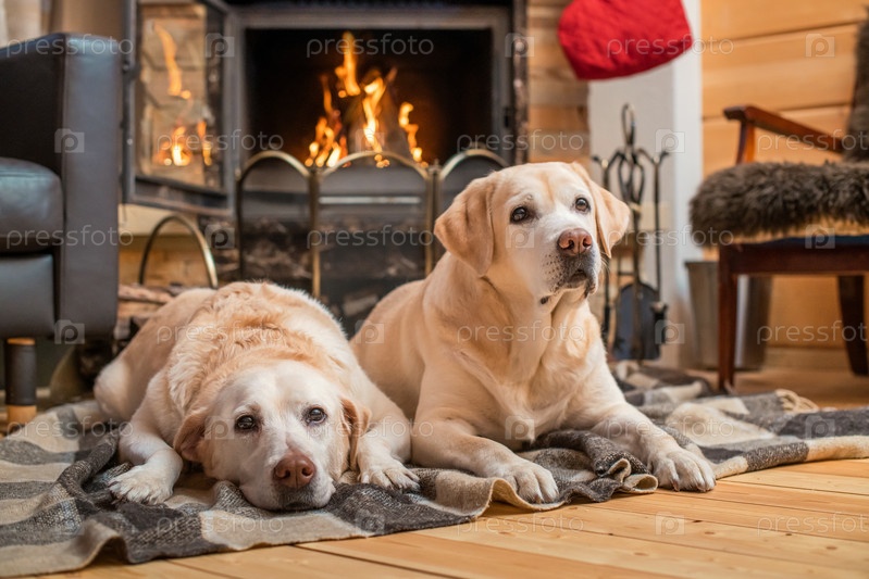 Пара золотистых лабрадоров-ретриверов лежит на одеяле перед камином в загородном доме