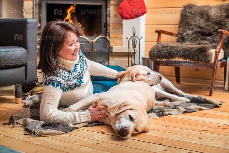 Золотистые лабрадоры-ретриверы лежат вместе с азиаткой средних лет на одеяле перед камином в загородном доме